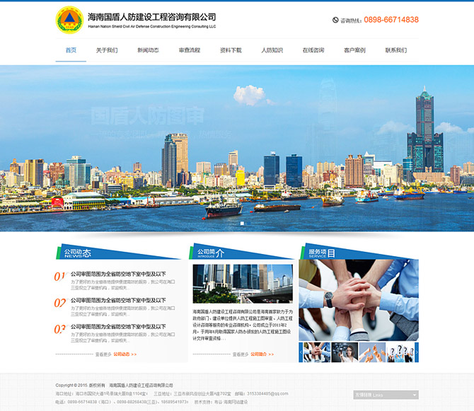 海南國盾人防建設工程咨詢有限公司是海南首家致力于為政府部門、建設單位提供人防工程施工圖審查、人防工程設計咨詢等服務的專業咨詢機構。公司成立于2011年3月,于同年6月取得國家人防辦頒發的人防工程施工圖設計文件審查資格證。現有各專業審查人員18人, 其中建筑專業4人,結構專業4人,通風專業3人,電氣專業4人,給排水專業3人。全部具有國家認證的注冊工程師資格及人防專項審查師資格。