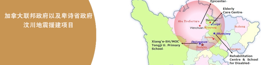 援建項(xiàng)目的第一期工程已經(jīng)在有條不紊的進(jìn)行之中,包括重建都江堰向峨小學(xué)、綿陽(yáng)的一所殘疾人康復(fù)學(xué)校、以及北川擂鼓鎮(zhèn)的一所養(yǎng)老院,全部位于被地震嚴(yán)重?fù)p毀區(qū)域。所有的重建建筑都將采用加拿大先進(jìn)的現(xiàn)代木結(jié)構(gòu)建筑技術(shù)以期達(dá)到好的抗震和節(jié)能效果。
