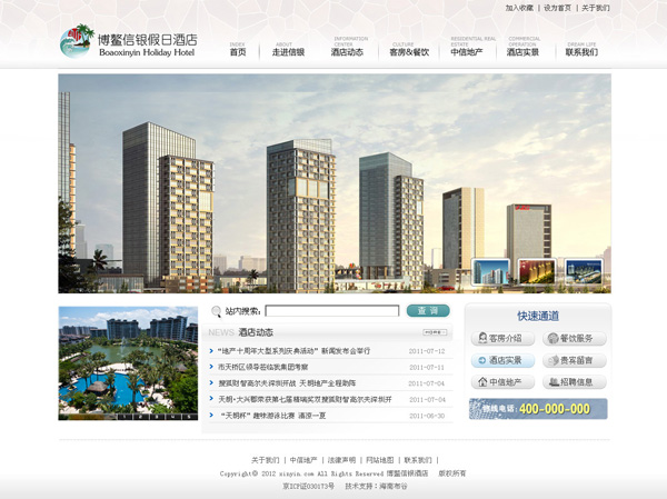 日前,博鰲信銀酒店委托我司建設酒店宣傳網站。 據了解, 瓊海博鰲信銀假日酒店是由中信銀行獨資公司設立,主要為本銀行系統內中小型銀企會議和員工及銀行客戶的休假提供服務。