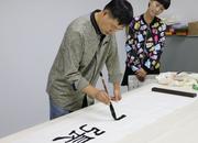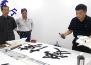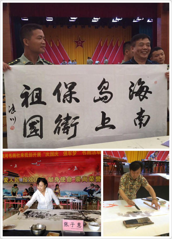 經過約一個半小時的路程,大家到達了今天活動目的地-省軍區某部,部隊首長和人民子弟兵早早的在機關辦公樓前列隊等候萬泉河書畫社的各位書畫家老師們,爾后,部隊首長致歡迎辭,董德川社長講話和進行書畫作品贈送儀式。集體合影結束后大家觀看匯報片并參觀辦公樓、參觀部隊文化活動中心與官兵交流進行指導